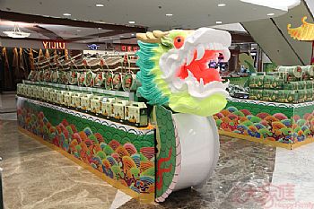 粽子节是中华民族的传统节日,流传至今,渊源流长。不同的地方有不同的风俗习惯及文化,赛龙舟,跳花车等都是中华民族人民对节日的喜爱。而上图陈列礼盒包装均以红色为主,红色更易突出商品,更吸引顾客的眼球,礼盒装统一陈列在一起,更易方便顾客选购!结合龙头一推头形式连城一体,仿佛在卖场里搭建了一艘生动形象而喜庆洋洋的大龙舟,更突显了中华民族的喜庆热闹氛围。