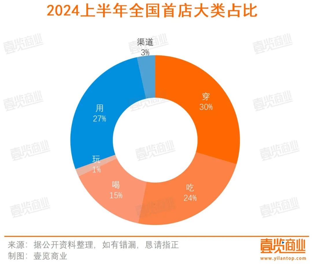 来源 /壹览商业 撰文 / 蒙嘉怡 2024上半年,品牌明显加快了首店布局的步伐。 据壹览商业不完全统计,2024年上半年,品牌们共开出204家首店,已经超出2023年全年开出的首店数量,同比增长88.89%。其中,1月份为新开门店最多的月份,数量达49家,其次是5月,开出43家首店。 从业态分布看,穿和用是上半年的热门业态,加起来共有116家全国首店,占比约为56.86%。其中,服饰类首店数量最多,为51家,占比达25%。算下来,吃、穿、用三大