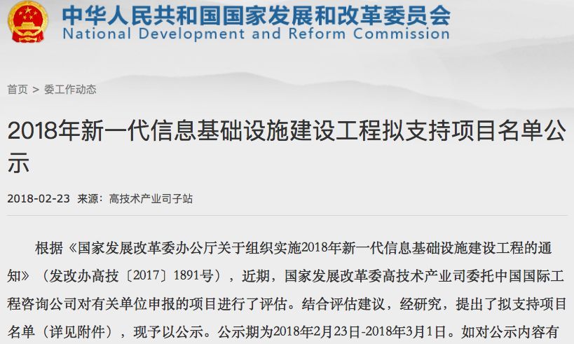 2月23日,国家发改委官网公布了《2018年新一代信息基础设施建设工程拟支持项目名单》。八个项目中,三大运营商5G规模组网建设及应用示范工程位列其中。今年年初,5G技术研发试验第三阶段规范正式发布,通过5G技术研发试验第三阶段的测试,预计在2018年底,我国5G产业链主要环节基本达到预商用水平。