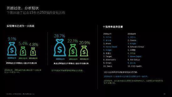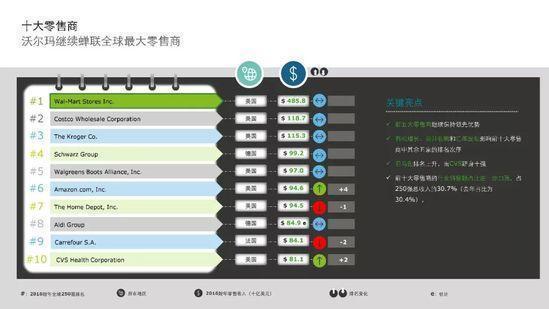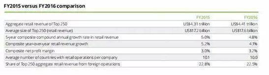 这份报告的一大重磅看点是其《全球零售力量250强》榜单情况:最新报告显示,2016财年(截至2017年6月的财政年度),全球250强零售商共创收4.4万亿美元,复合增长4.1%。