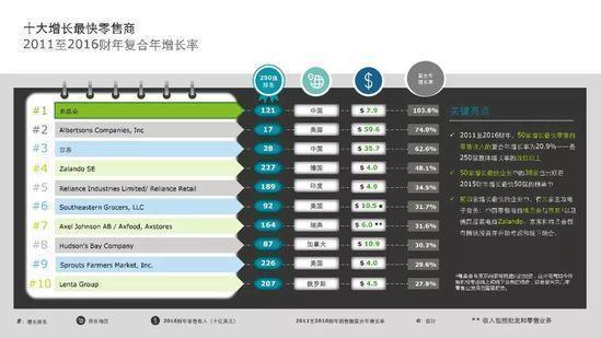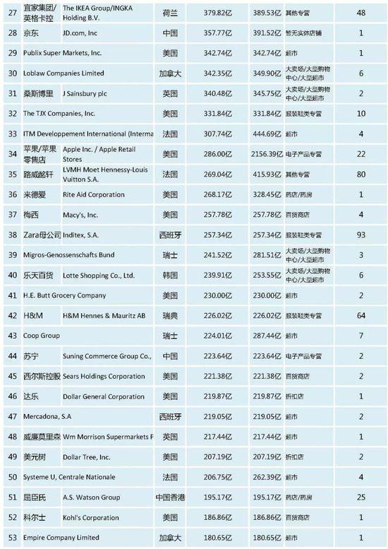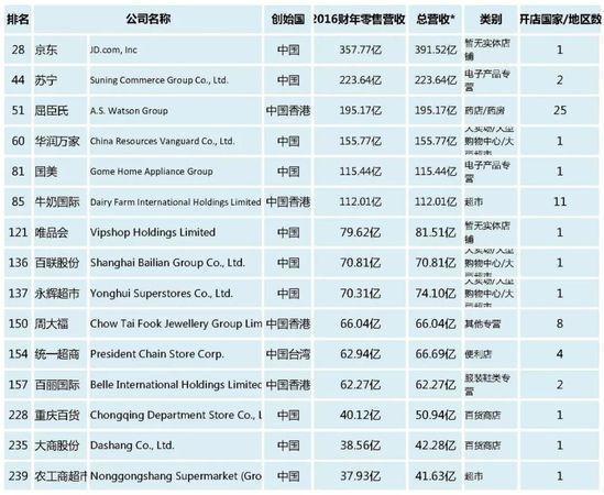 其中,中国零售商分别为:京东、苏宁、屈臣氏、华润万家、国美、牛奶国际、唯品会、百联股份(600827)、永辉超市(601933)、周大福、统一超市、百丽国际、大商股份(600694)、农工商超市。