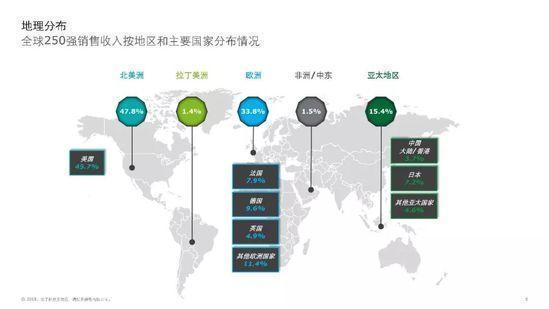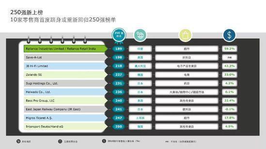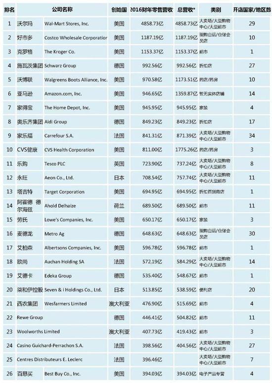 在德勤所统计的250家零售企业中,美国有80家,日本32家,德国17家,法国和英国各12家。中国(含香港、台湾)共有14家零售企业上榜,排名最高的是电商巨头京东,名列第28位。