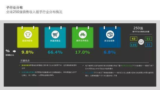 截至目前,快速消费品1零售商数量达135家,占250强总数的54%,平均零售收入近217亿美元,在250强中规模最大、数量最多,总收入占250强总收入的三分之二。
