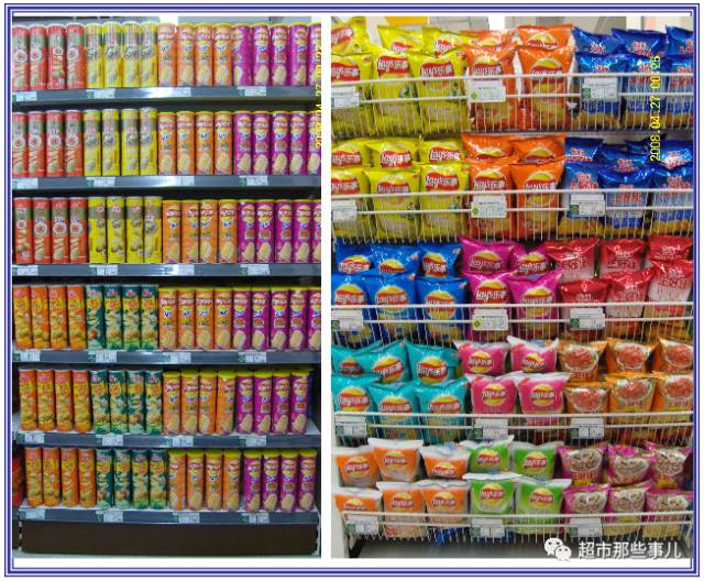 1、薯片沿顾客动线依次将筒装和袋装分开垂直陈列