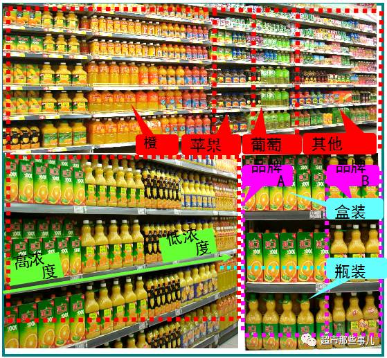在果汁品类中,首先根据顾客购买的决策树,将饮用方法和饮用场景不同的非浓缩果汁与浓缩果汁分开陈列,浓缩果汁陈列在货架后方。