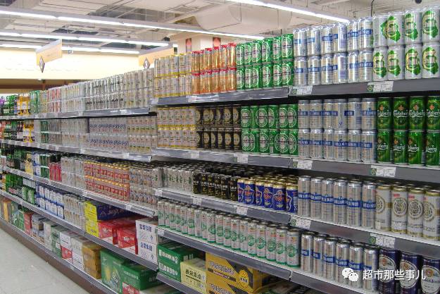 1、沿客流动线依次陈列:罐装啤酒、小瓶装啤酒、大瓶装啤酒,箱装或多包装啤酒陈列在货架下方。