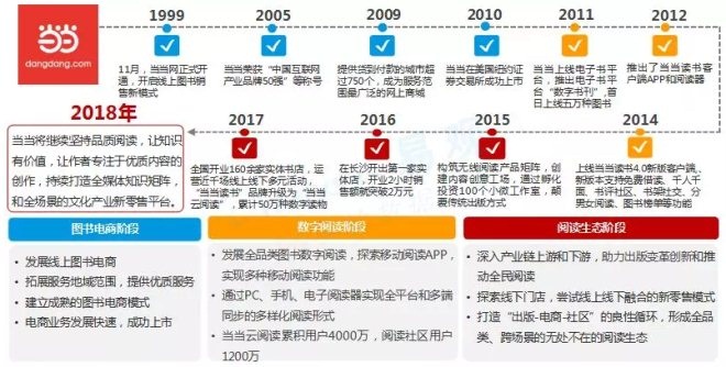 1999年创办的当当网是中国最早的电子商务公司之一,从卖书起步,一步步发展成了一个综合性电商平台。经过图书电商阶段、数字阅读阶段,至今已经发展到“阅读生态阶段”。