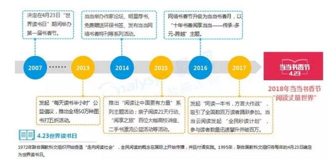 报告也显示,当当网从2007年开始每年4月举办的“4.23书香节”活动,在推动全民阅读活动中产生了重大影响。尤其是2013年书香节发起“每天读书半小时”公益倡议;2014年书香节举办作家论坛、明星荐书、免费赠送环保书签;2015年书香节推出“阅读让中国更有力量”系列主题活动;2016年以“十年书香阅享当当——传承-多元-跨越”主题升级为书香月;2017年发起“同读一本书,方言大作战”和 “全民秒读计划”,参与读者数量迅速攀升并破百万,都产生了巨大影响。