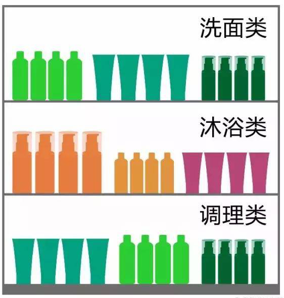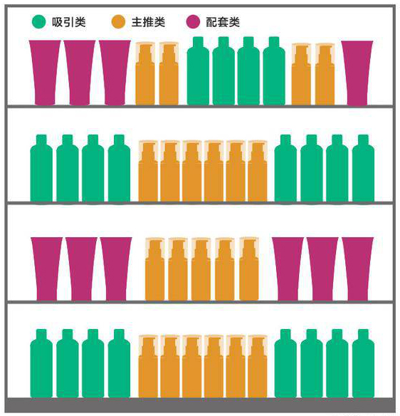 而中岛柜因为柜台自身的因素,会以品类陈列为主。不同品牌的同一品类聚集在一块,更方便顾客同类比较。要注意的是,并非同一品类一定要摆一排,以横向扎堆是主原则,但也可以穿插的以竖向扎堆为辅助,不要死板。