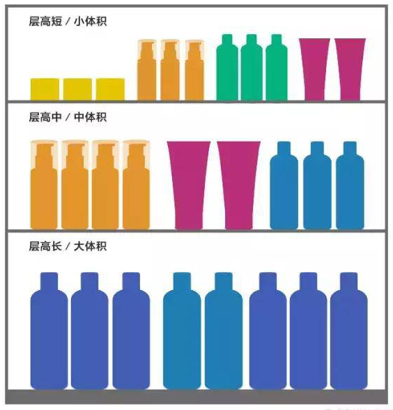 更重要是,小体积货需要近距离的观察,不可能把它放到最下面。大体积货因为目标够大,放差一点的位置,也不影响顾客看它。