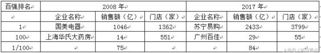 从单个规模看,2017年百强平均规模为218亿,2008年为120亿,增长近一倍。2017年百强第1名苏宁易购的销售额是第100名广州百佳的84倍。2008年第1名国美电器销售额是第100名华氏大药房的75倍,说明企业的规模差异在扩大。