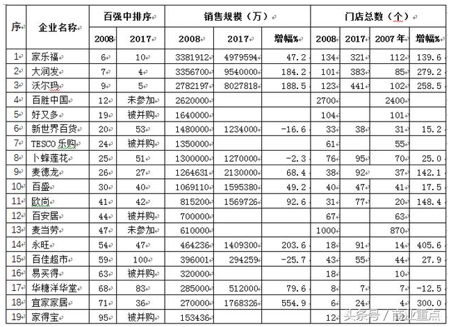 但也有国有零售企业以信念和坚守,与行业共同成长,甚至超越平均增幅。如王府井百货的销售额从2008年120亿增加到2017年的337亿,排名从第28位升至15位;超市发的销售额从2017年23亿增加到2017年的47.8亿,排名稳定在80位左右。两家不仅是国有零售百货和超市企业发展的表率,也是行业在百货转型升级和社区商业发展方面的样板。