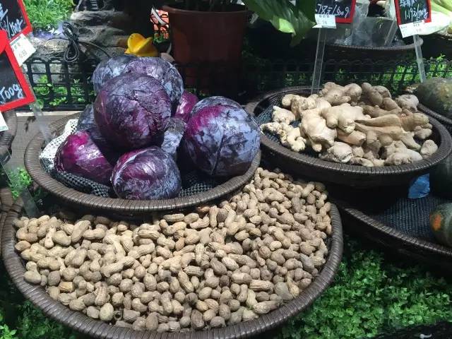 圆形或者无规则的蔬果可利用道具,让其以丰满、新鲜的方式展示给消费者。像图中的花菜用保鲜膜包好、称量好堆放在道具中看起来是不是很有质感;西红柿被放置在暗色的圆形道具中,表面还有一层水珠,娇艳欲滴;土土的花生散装在箩筐里,就像刚从地里拿回来的。