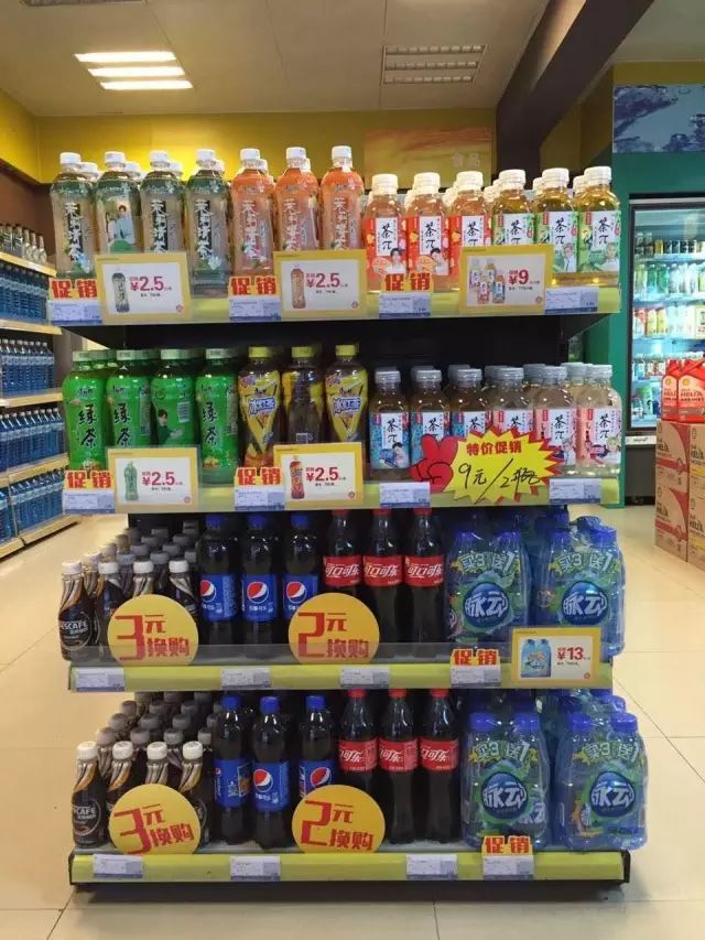 当然,若想做好生动化,创新必不可少。将饮料瓶组装成自行车造型,就让人眼前一亮。特殊陈列,特别有效果。