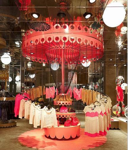 橱窗基本上是主题化,十分擅长使用模特和道具。模特无论从姿势、种类、位置和形态都各不相同,从而强调服装的多样性和搭配。