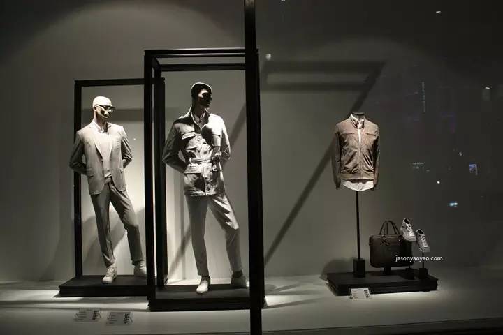 整体来说还是蛮注意亮色提亮等手法的使用。注意看下图出样西装的提亮手法,都是非常常规的品牌成衣店陈列方式。