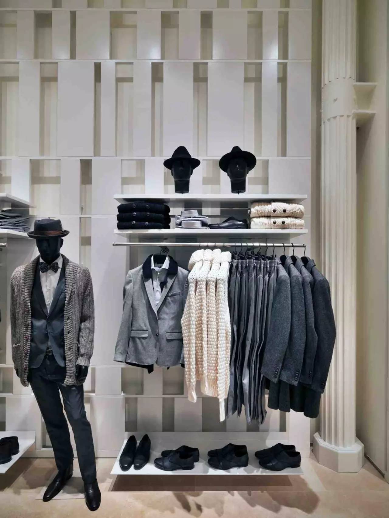 男装的展示区域分为正装区和休闲区,大部分为中性色和明度较低的颜色,配饰的搭配展示贯穿始终。