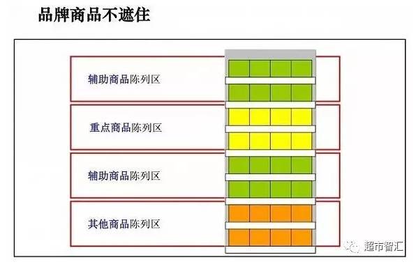 品牌商品是保障门店客流的重要品类,门店经营的品牌商品可以根据其销售的特点,确定属于重点商品、还是辅助或其他商品,从而进行位置的相应调整。但不应故意遮挡或藏匿。