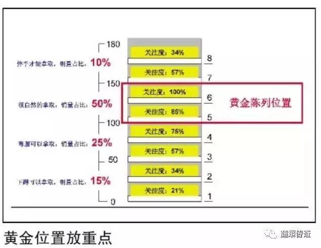 在同一组货架上,因为顾客注视的方式不同,所以不同陈列位置产生的销量会有不同的变化,一般来说,与视线平齐的位置陈列的商品销量最高,而顾客需要仰望和蹲下才能注视的商品销量相对要低。