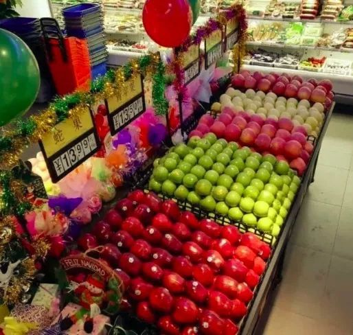 将商品的最优面朝向顾客,以苹果为例,把最红的一面面向顾客或鲜切水果的切割面面向顾客。