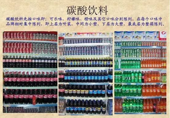 碳酸饮料先按口味即:可乐味、柠檬味、橙味及其他口味分别陈列,在每个口味中品牌相对集中陈列,即上层为听装,中间为小塑,下层为大塑,最底层为整箱陈列。