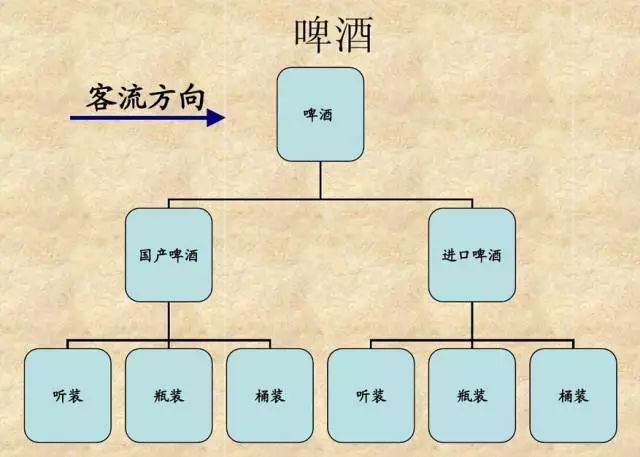 先将国产啤酒和进口啤酒分开陈列,再分别按照听装,瓶装及桶装陈列,小规格在上,大规格在下,相同包装商品品牌集中陈列。(最下层可做为整箱陈列)