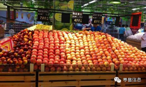 苹果陈列,两层,既体现量感,又控制损耗,所有苹果绝对是一个一个摆上去的,可见要求之高。