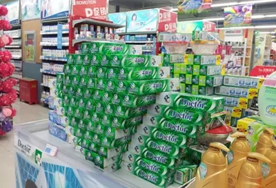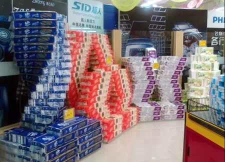 有些在日常生活中经常遇到的小件商品在陈列时一般不会引起人们的注意,用一些夸张的表现手法——异形陈列,可以增强这些商品陈列时的视觉效果。