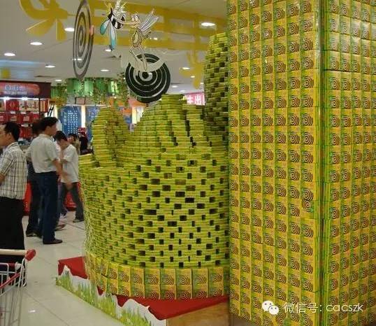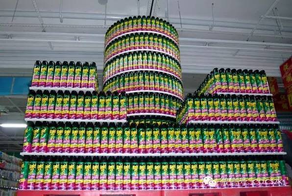 3.落地式陈列的堆头,在非销售区的陈列应是该堆头上所陈列的商品,并且做到颜色统一方向统一,里面可用其他商品或者纸箱做假底。