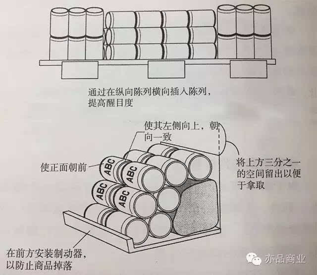 为了方便顾客浏览商品,要将其正面统一朝外;货架预留三分之一的空间,便于顾客拿取;另外,为防止商品掉落,一定要安装制动挡板。