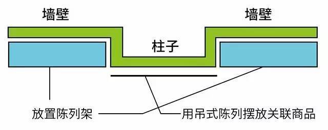 墙面柱总会导致卖场陈列的不连续,首先根据柱子的厚度,在其左右放入陈列架,然后在柱子上加板,用吊式陈列摆放与两侧关联的商品。