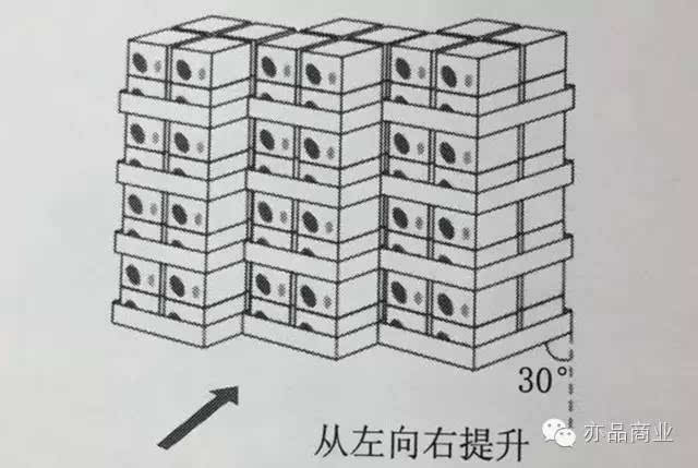 堆积时,要展示商品正面且高度低于顾客的黄金区域,即便于拿取又能保持其稳定。堆积容易倒塌的商品时,为增强其稳定感,要像砌砖一样交错堆积。