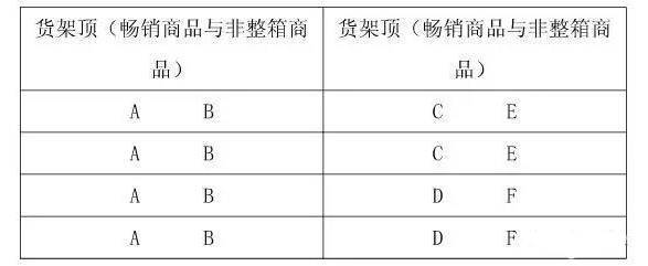 A、B、C、D为一个小分类4个不同单品代码,以2组货架为例。