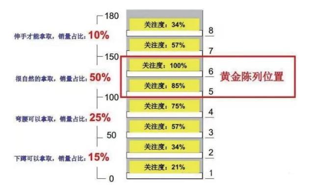 最好销的产品放在货架最好的位置,最好的位置也是单位面积销量(坪效)最大的位置,如货架区内人流走向的前1/4至1/2处且处于视平线高度与取货线高度(1.2米~1.45米之间)就应摆放畅销的产品