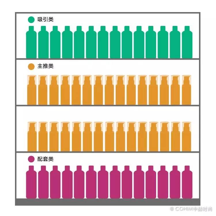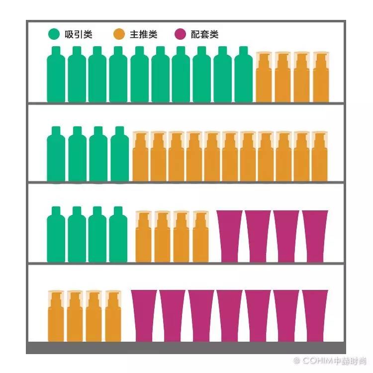 而中岛柜因为柜台自身的因素,会以品类陈列为主。不同品牌的同一品类聚集在一块,更方便顾客同类比较。要注意的是,并非同一品类一定要摆一排,以横向扎堆是主原则,但也可以穿插的以竖向扎堆为辅助,不要死板。