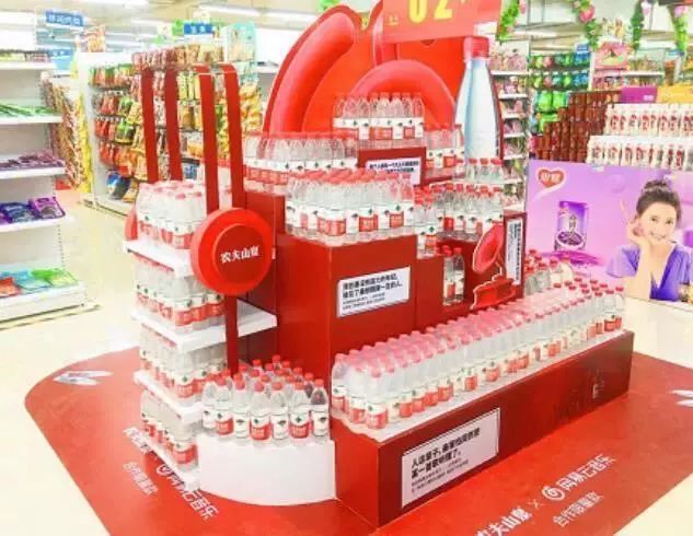 5. 瓶盒分离陈列。在产品堆放好之后,拆除一些包装,作为瓶型陈列。在堆头上进行瓶型陈列,能提高视觉冲击力,增加消费者的购买欲望。