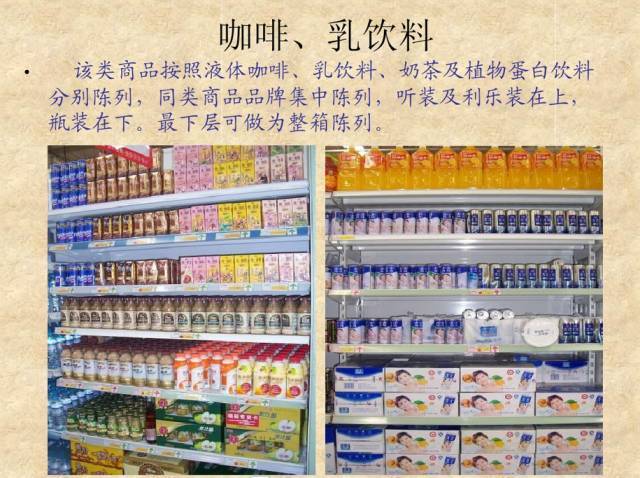 该类商品按照液体咖啡、乳饮料、奶茶及植物蛋白饮料分别陈列,同类商品品牌集中陈列,听装及利乐装在上,瓶装在下。最下层可做整箱陈列。