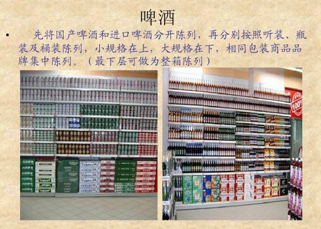 先将国产啤酒和进口啤酒分开陈列,再分别按照听装,瓶装及桶装陈列,小规格在上,大规格在下,相同包装商品品牌集中陈列。(最下层可做为整箱陈列)