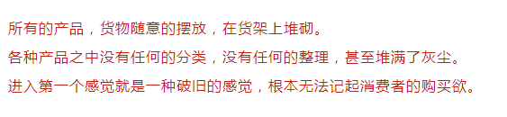 这样的店面就是没有陈列的陈列,连陈列最基础的整齐,整洁都做不到。这样的店面大多数集中在乡镇,现在已经很少见到(已经被时代所淘汰)!