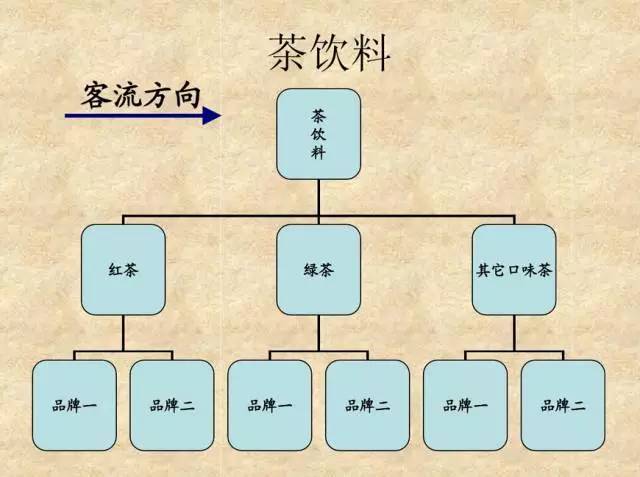 茶饮料按口味分为红茶、绿茶及其他口味茶三类陈列,同口味商品品牌集中陈列,小规格(或利乐装)在上,大规格在下。最下层可做整箱陈列。