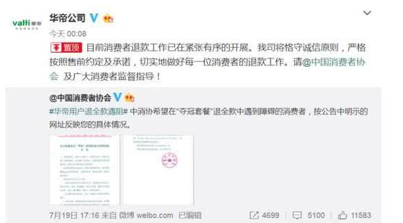 联商网消息:7月20日,华帝股份在官方微博上回应了中消协发布的公告,其表示,目前消费者退款工作已在紧张有序的开展。公司将恪守诚信原则,严格按照售前约定及承诺,切实地做好每一位消费者的退款工作。请中国消费者协会及广大消费者监督指导。