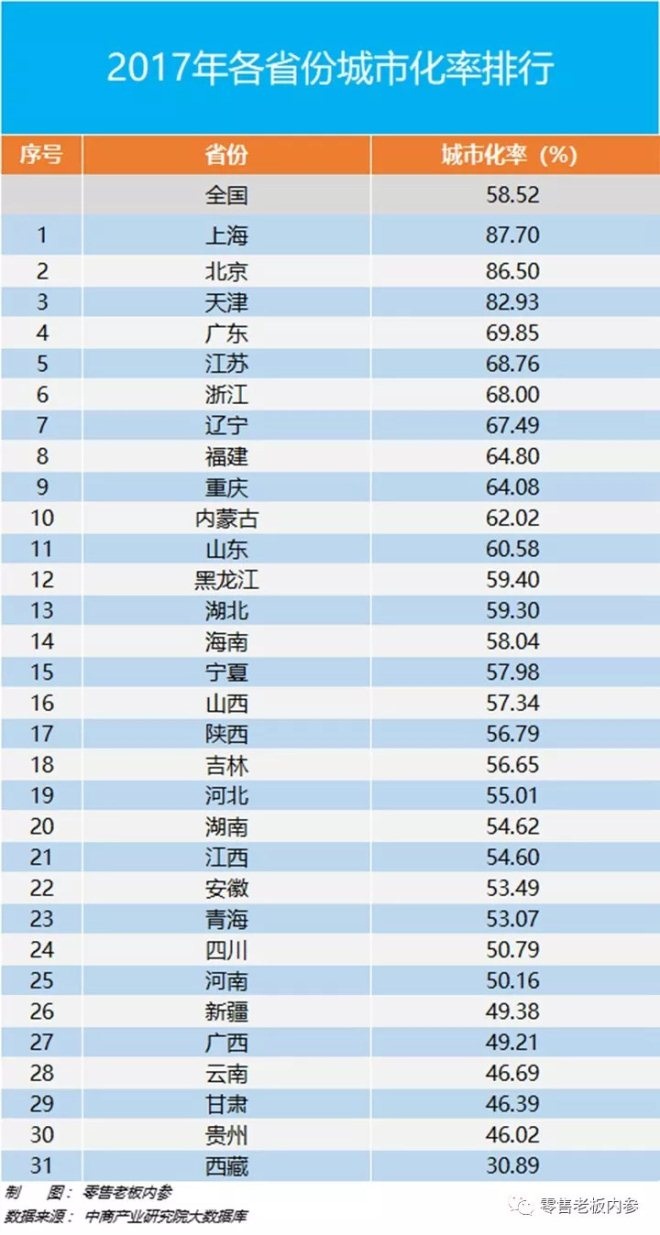 其次,再看看2017年各个省份的城市化率,我们就能知道为什么这些地区的便利店发展的异常迅猛。从下图可以看出,其中超过全国平均水平的省份就有13个。