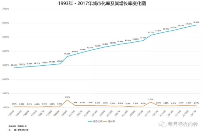 进入90年代以后,中国城市化已从沿海向内地全面展开。1992年-2000年,城市化进入全面推进阶段,以城市建设、小城镇发展和普遍建立经济开发区为主要动力。在1993年至2017年的这26年中,城市化率从28.14%上升至58.52%,提升了两倍多。
