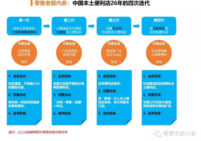 在这整个发展历程中,零售老板内参APP从业态定位的转变、经营方式的改善以及技术应用的提高,这三方面对中国本土品牌便利店的发展迭代进行了一次详细而独有的划分。