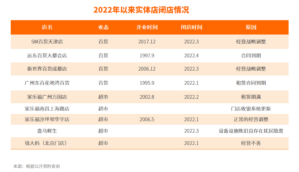 据不完全统计,在从2022年以来,有将近10家实体店宣布关闭,其中包括SM百货天津店、远东百货大都会、家乐福中国三家门店,以及盒马鲜生等。从业态来看,百货行业中有4家企业门店宣布闭店,超市行业有5家门店宣布关闭。