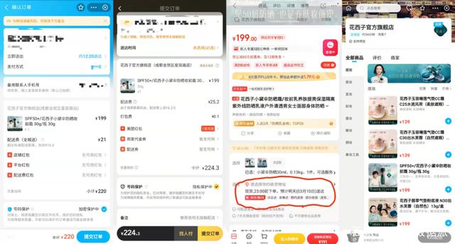 我们随机选择一款该品牌防晒妆前霜,其在淘宝官方旗舰店的售价为199元,包邮,配送时长一般是3~4天。