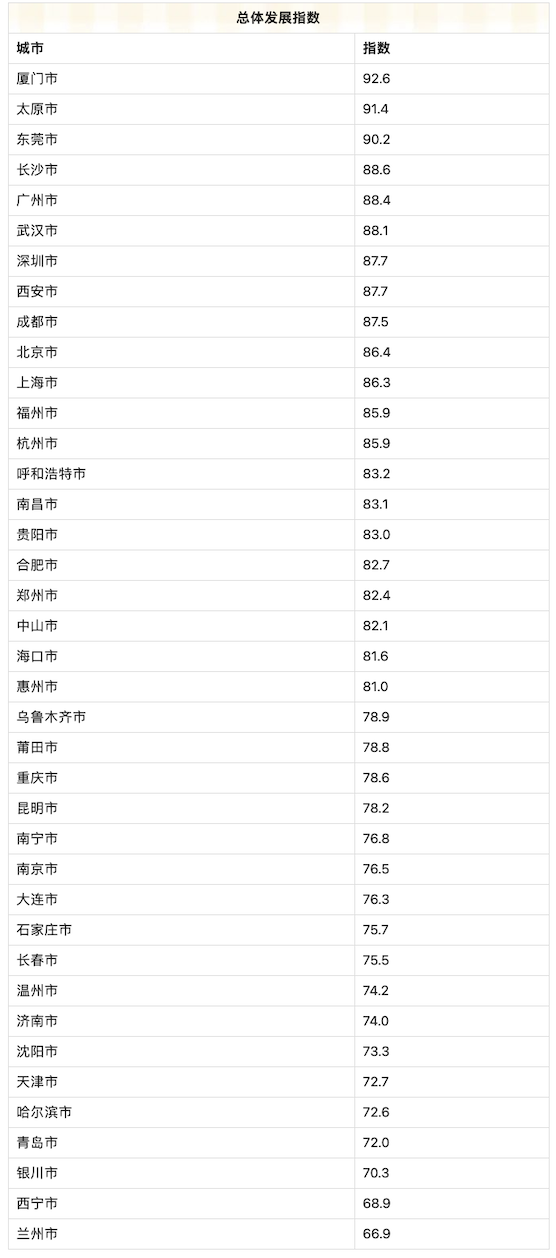 指数的核心数据为各城市便利店的饱和度、门店总量的增速、24小时便利店的比例及营商环境情况。在此基础上,计算出了各城市的便利店发展指数。其中,厦门、太原、东莞、长沙、广州的便利店发展指数名列前五位。
