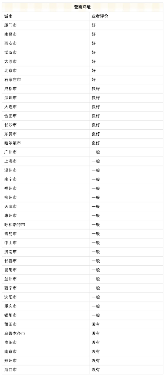 营商环境指数:按照调查出的好、较好、良好、一般、较差、差,降幅赋值100-50。