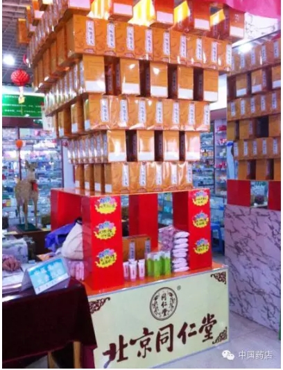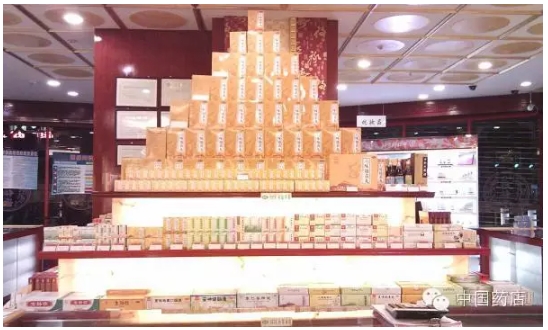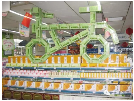 面对这幅陈列作品,心里只有两个字——震撼。能通过一些小小的药盒,组成如此令人叹为观止的作品,殊为不易。其间架结构,大规格制作,足够引起进店之顾客围观。对于门店、药品的品牌形象宣传可谓下足了功夫。