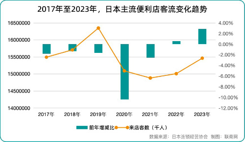 根据日本连锁经营协会数据,2020年日本主流便利店客流量同比减少10.4%,成为一个重要的分水岭。由此可知,便利店的客流量增长率在疫情前就已经开始放缓。即便2022、2023年度分别同比增长0.6%和2.9%,但还是迟迟没有恢复到疫情前水平。